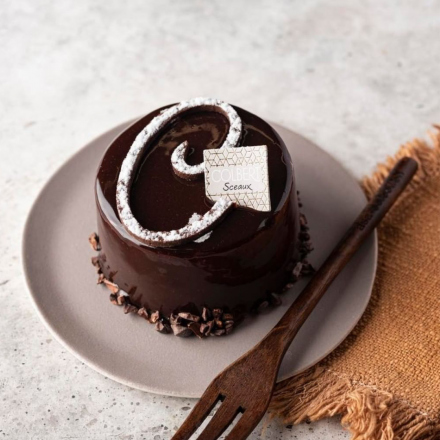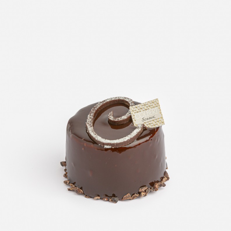 Croustillant praliné, biscuit cacao, crémeux vanille de Madagascar, mousse chocolat noir 70 % de cacao Komélé, glaçage chocolat et grué de cacao.