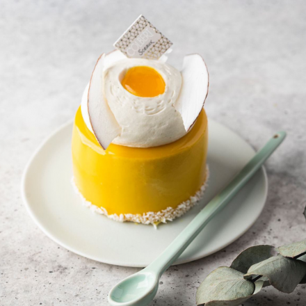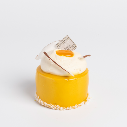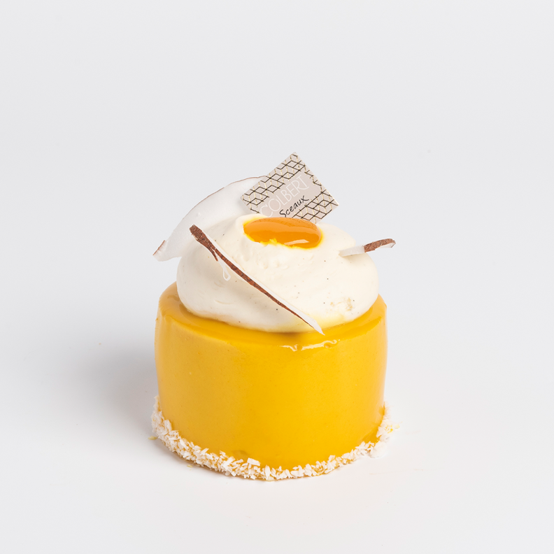 Mousse caramel passion, ananas rôti, streusel praliné coco, dacquoise coco et coulis passion.